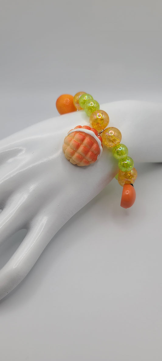 Orange and Green Beaded Elastic Bracelet with Orange and Pastry Bread Charms