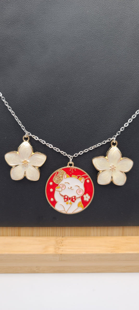Maneki-neko Welcoming Lucky Cat and White Sakura Charm Silver Chain Necklace