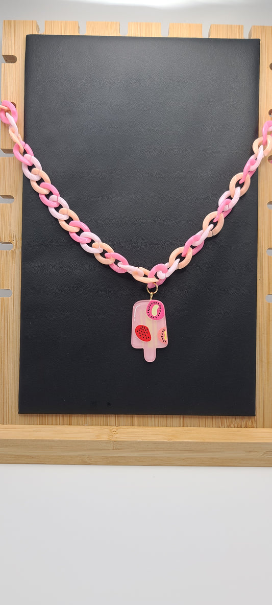 Pink and Peach Plastic Chain Necklace with Strawberry and Dragon Fruit Popsicle Acrylic Charm